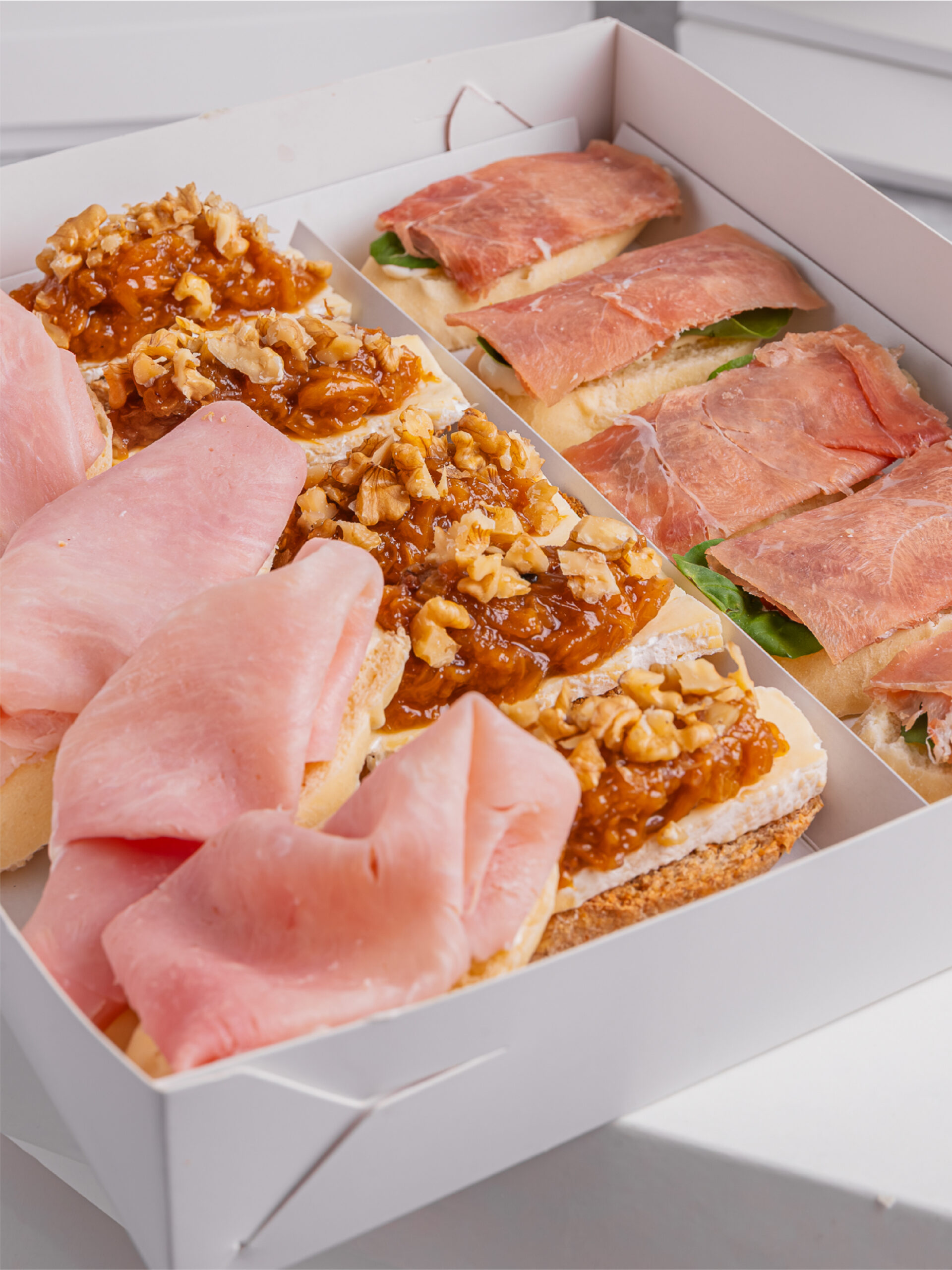 5 un. Tapas de jamón crudo, tomates confitados, crema de hierba sobre pan de baguette fresca